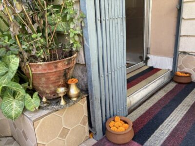 泊まってたゲストハウスの入り口。オレンジ色のマリーゴールドが飾られています。